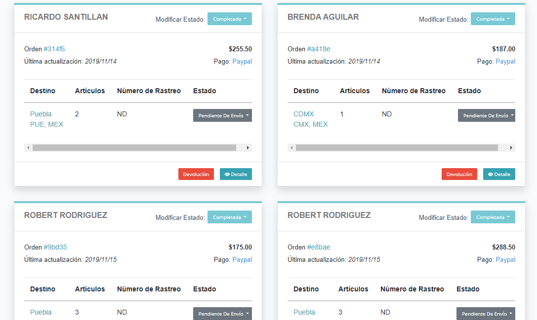 Da seguimiento a los pedidos de tus clientes, notifícales a través de un correo electrónico automatizado si su pedido va en camino al marcar una orden en tránsito o indica cuando un pedido ya fue entregado a tu cliente y lleva un control de tus entregas. Gestiona todo el seguimiento desde un mismo panel del control.