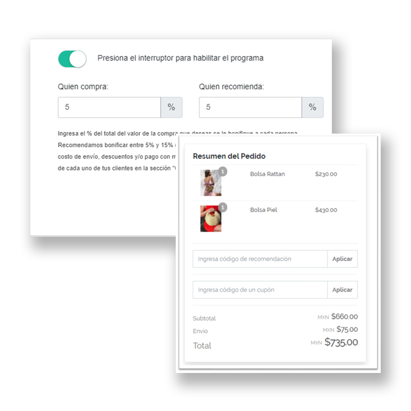 El programa de Lealtad te ofrece herramientas de marketing digital que incluyen cupones para bonificaciones, descuentos especiales a clientes frecuentes y un Programa de Recomendaciones que permite recompensar a quien recomienda y a quien compra el producto (Word of Mouth) a través de una bonificación a monedero electrónico. Todo esto con base en las mejores prácticas de comercio electrónico.